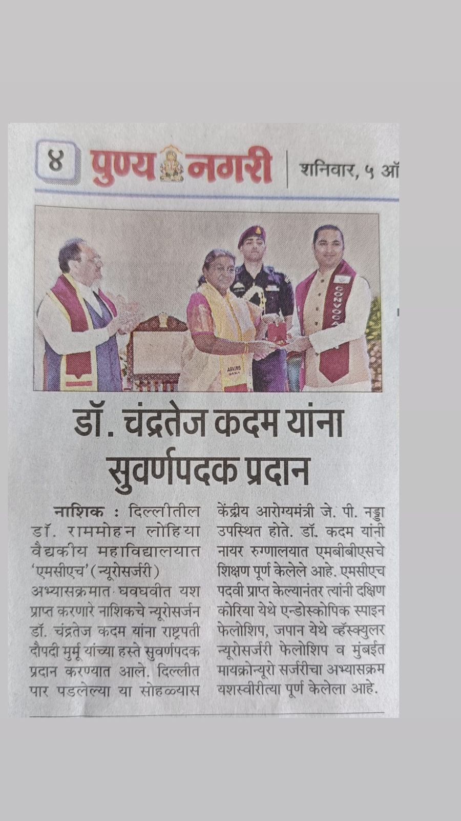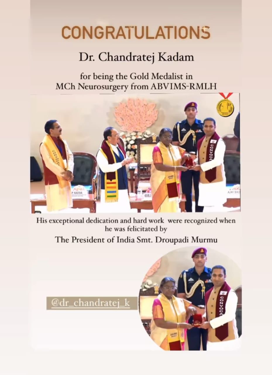 We are thrilled to announce that Dr. Chandratej Kadam, our renowned Consultant Neurosurgeon, has been awarded the prestigious Gold Medal in Neurosurgery by the Hon’ble President of India, Smt. Droupadi Murmu, alongside Sh. J.P. Nadda, Hon'ble Union Minister of Health and Family Welfare, Govt. of India. 🏅✨